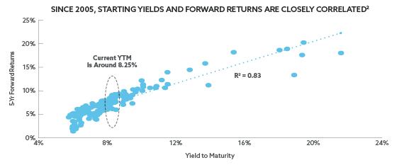 (1) As of 13 February 2023. (2) ICE Data Services, Morningstar. Monthly yields and 5-year forward returns for the ICE BofA US High Yield Index from January 2005 through December 2018.